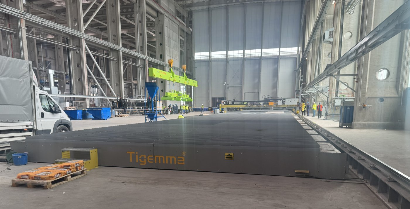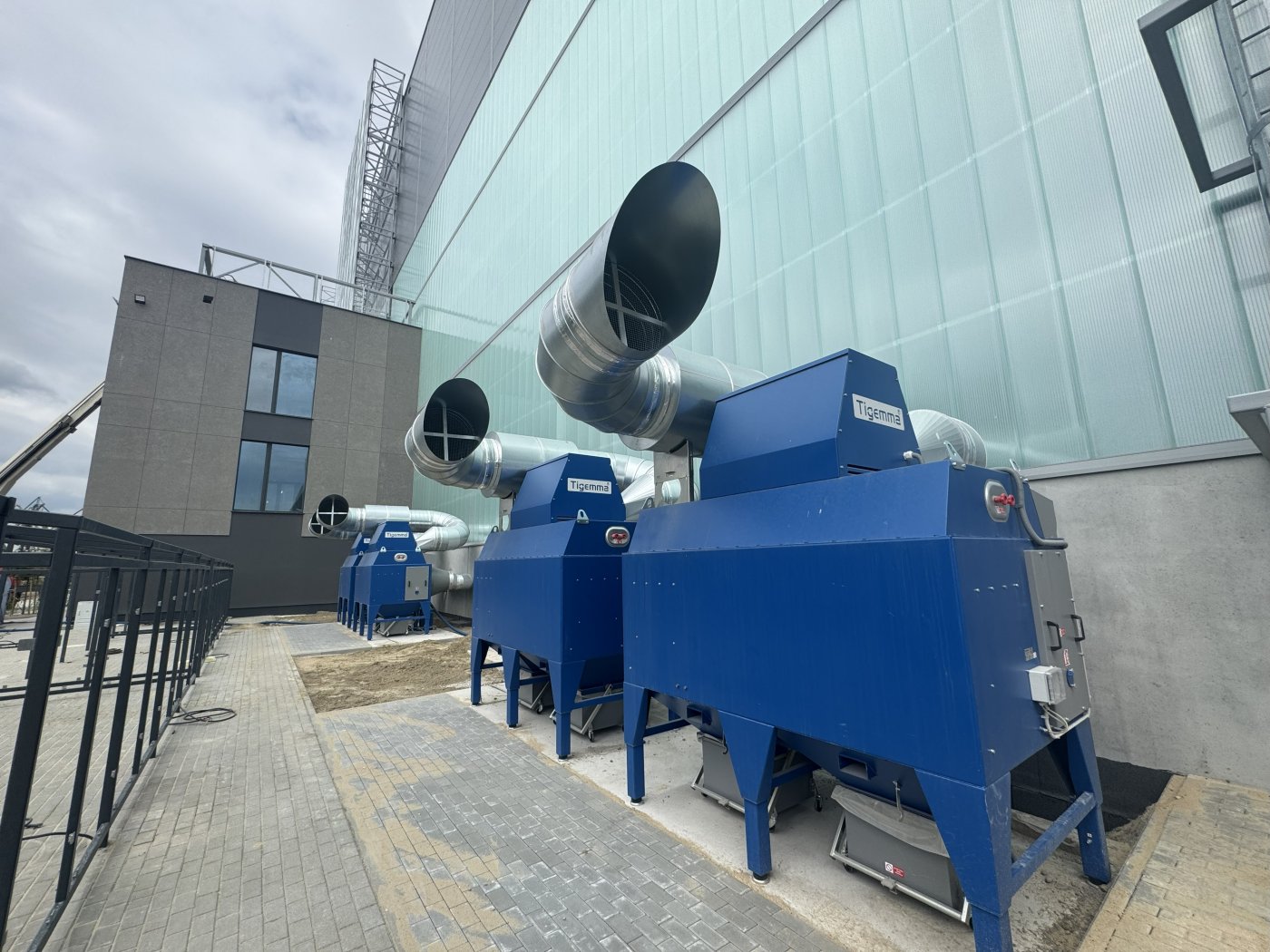 Sestava odsávaného stolu střední řady 7,5 x 51,75 m a čtyř filtračních jednotek TFS 11700 s integrovaným lapačem jisker.